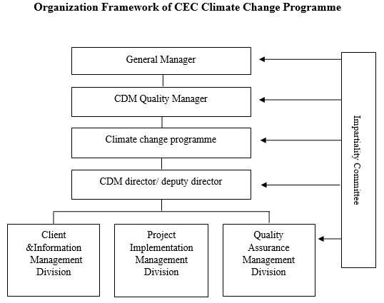 The Climate Change Programme is completely responsible for its operation as a DOE. It sets up the CDM director, deputy CDM director, the client & information management division, project implementation management division, and quality assurance management division.